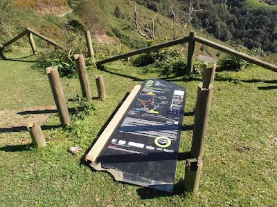 | Un cartel del Anillo, destrozado en el alto de La Colladiella |